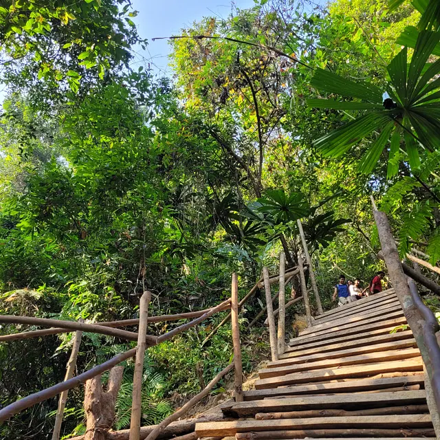 The trek is roughly 1–1.5 km downhill, but numbers don’t tell the truth. The ground is damp. The air is thick. Leaves brush against your legs. Your breath slowly changes.